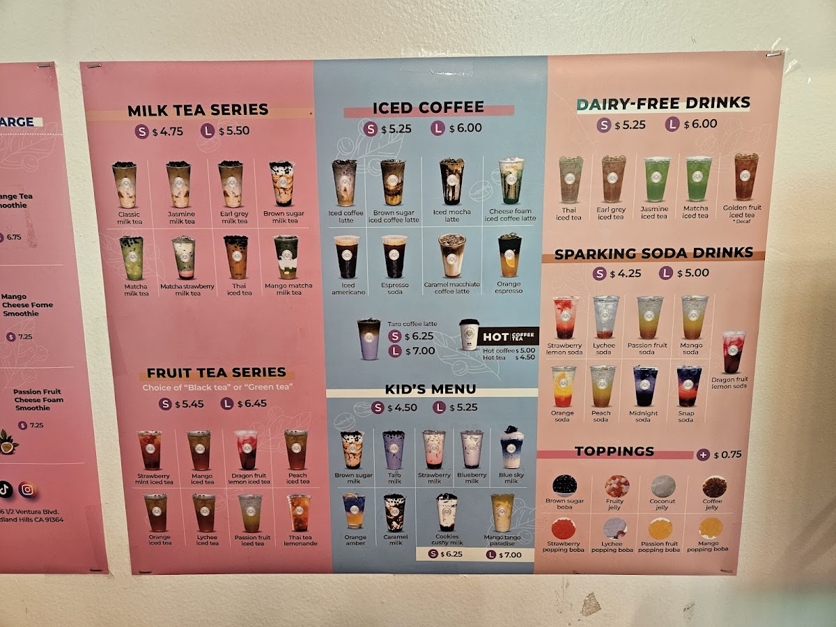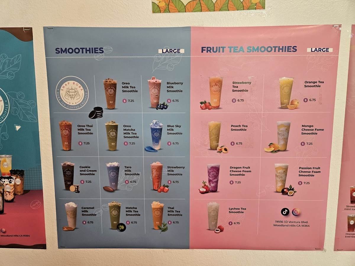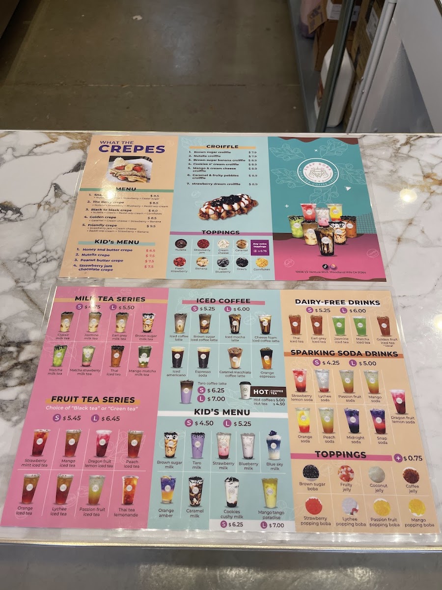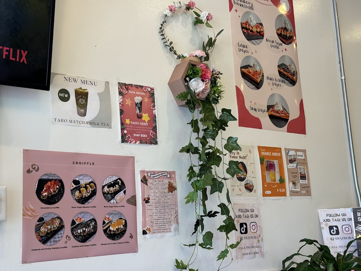 From a reviewer’s perspective, the menu at Snap Boba offers an impressively diverse selection that caters to both drink lovers and those craving light bites. The hot beverage lineup, including Hot Caramel Macchiato, Hot Coffee Latte, and Hot Mocha Latte, pairs nicely with savory options like Ham And Cheese Crepes or the more adventurous Spicy Shredded Pork Crepes. Their yogurt-based drinks, such as Mango Yogurt Smoothie and Strawberry Yogurt Smoothie, provide a refreshing contrast to richer choices like the Oreo Matcha Milk Tea Smoothie or Brown Sugar Iced Coffee Latte. The menu also shines with its creative specialties, including croiffles like Cookies N' Cream Croiffle and Strawberry Dream Croiffle, as well as classic and signature crêpes like California Crepe and Hollywood Crepe. For younger guests, the kid-friendly selections such as Nutella Crêpe and Cookies Cushy Milk add a thoughtful touch. Meanwhile, tea enthusiasts can explore options like Jasmine Milk Tea, Dragon Fruit Lemon Iced Tea, or Passion Fruit Soda, ensuring there’s something for every palate. Overall, while prices aren’t listed, the sheer variety and creativity of the offerings make Snap Boba’s menu feel both fun and satisfying, striking a balance between indulgent treats and refreshing beverages.